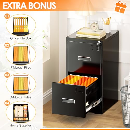 INTERGREAT 2 Drawers File Cabinet with Lock, 18″ D Vertical Filing Cabinet for Home Office, Metal Black File Cabinet for Hanging Letter/F4/A4/Legal Size Folders, Easy Assemble