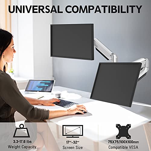 MOUNTUP Dual Monitor Desk Mount, Die-Cast Aluminum Fully Adjustable Double Monitor Arm with Gas Spring, Computer Monitor Stand Fits 2 Screen 17 to 32 inch – Each Arm Holds up to 17.6LBS, MU0024