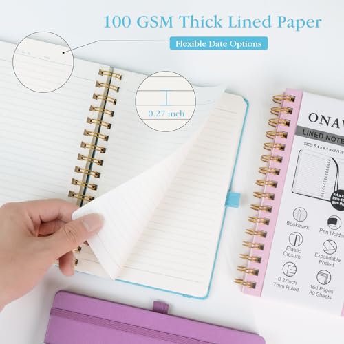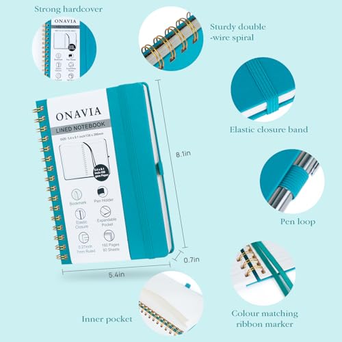 【Hardcover Spiral Notebook】ONAVIA lined spiral bound notebook features sturdy metal double-wire binding and durable and water-resistant hard cover. The professional hard cover will effectively protect the internal paper of the journals from damage. And the gold-color twin-wire design allows for easy turning pages, folding and flat laying 180°, and keeps pages attached reliably and provides a comfortable writing surface.